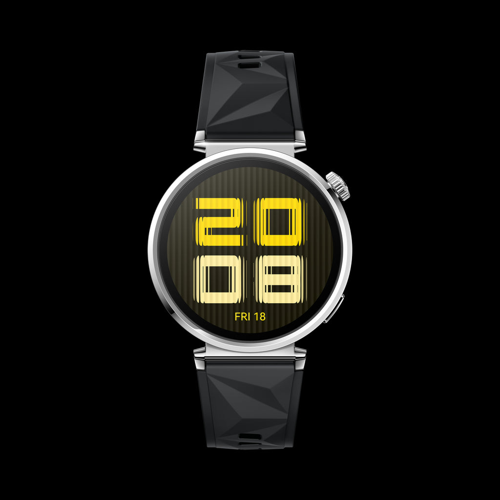 41mm/1.32inch AMOLED / Black Fluoroelastomer Strap.Front case:Silver stainless steel. 323 mAh IP68