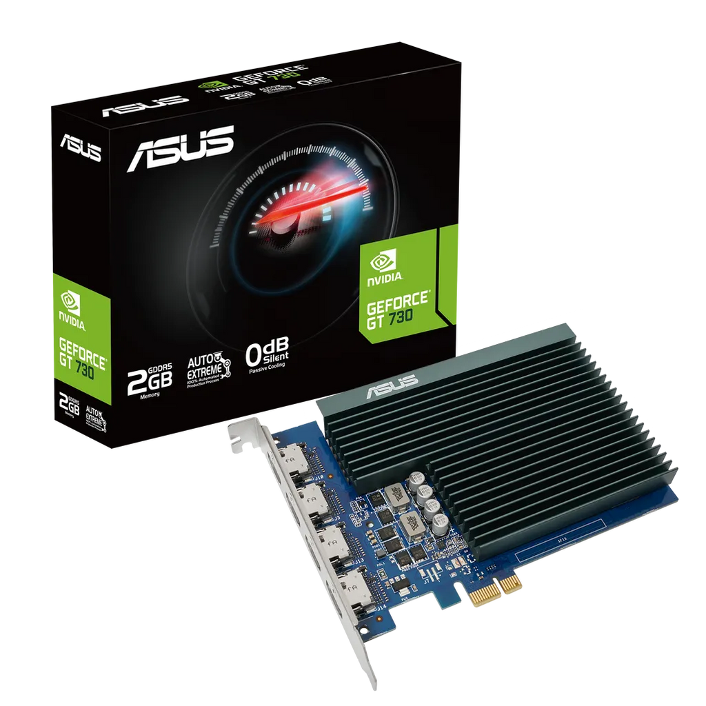 ASUS GT730-4H-SL-2GD5. Graphics processor family: NVIDIA, Graphics processor: GeForce GT 730. Discrete graphics card memory: 2 GB, Graphics card memory type: GDDR5, Memory clock speed: 5010 MHz. Maximum resolution: 3840 x 2160 pixels. OpenGL version: 4.6. Interface type: PCI Express x1. Cooling type: Passive