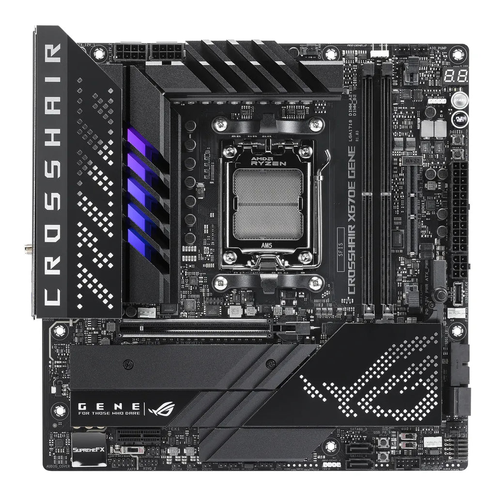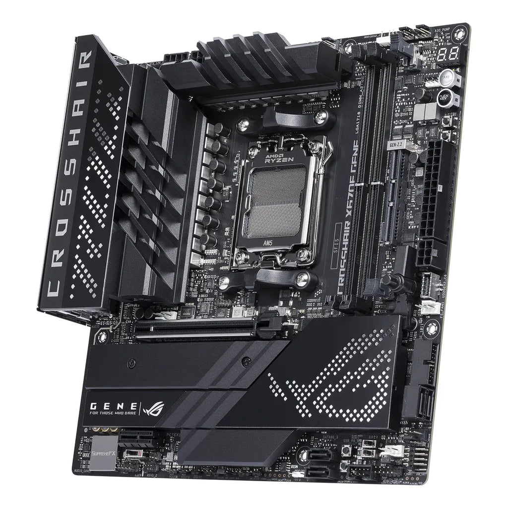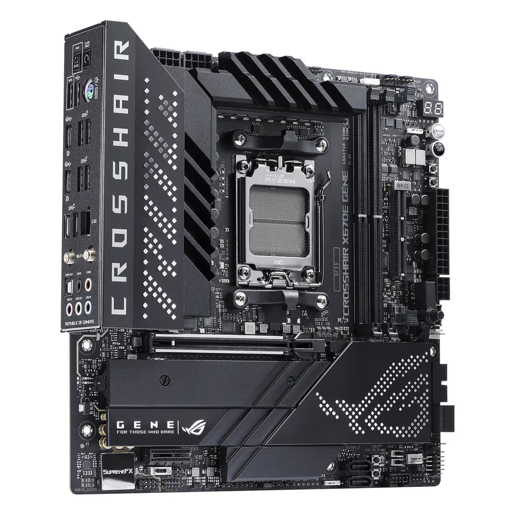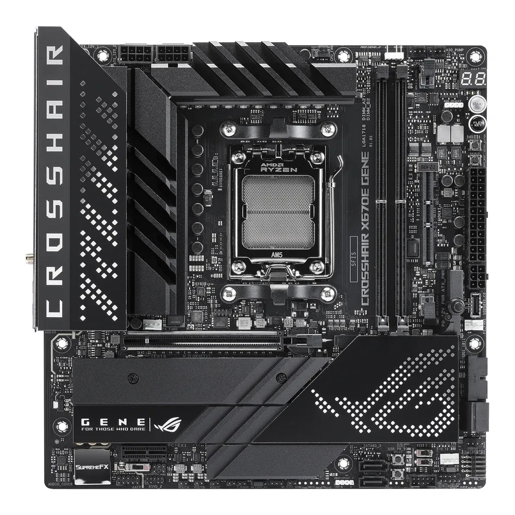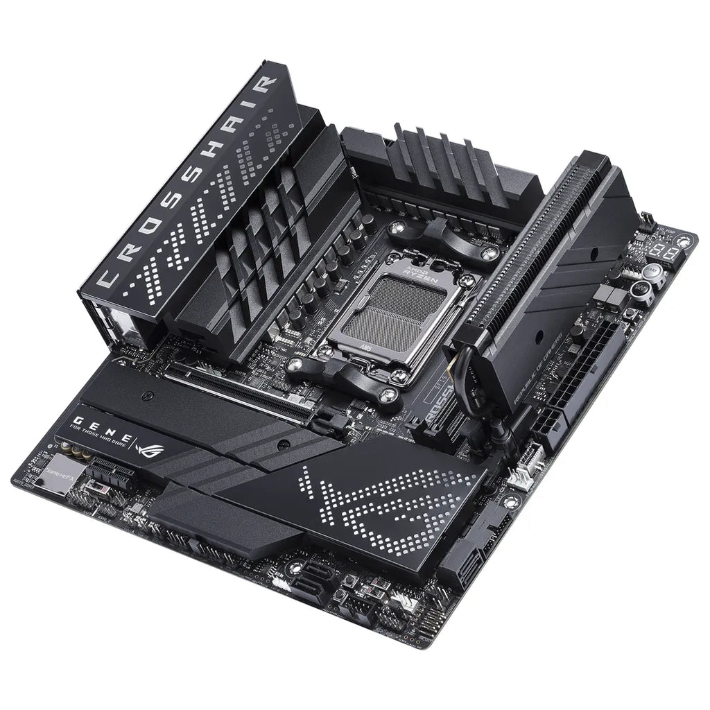 ASUS ROG CROSSHAIR X670E GENE. Processor manufacturer: AMD, Processor socket: Socket AM5, Supported processor sockets: Socket AM5. Supported memory types: DDR5-SDRAM, Maximum internal memory: 64 GB, Memory slots type: DIMM. Supported storage drive interfaces: M.2, SATA III, Supported storage drive types: HDD & SSD, RAID levels: 0, 1, 10. Ethernet interface type: 2.5 Gigabit Ethernet, Top Wi-Fi standard: Wi-Fi 6E (802.11ax), Wi-Fi standards: 802.11a, 802.11b, 802.11g, Wi-Fi 4 (802.11n), Wi-Fi 5 (802.11ac), Wi-Fi 6 (802.11ax), Wi-Fi 6E.... Component for: PC, Motherboard form factor: micro ATX, Motherboard chipset family: AMD