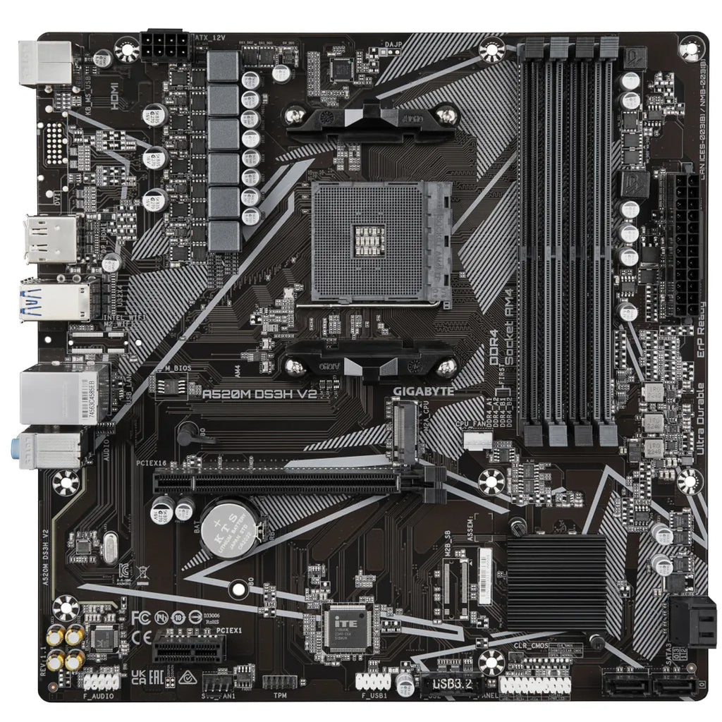 Gigabyte A520M DS3H V2 Motherboard - Supports AMD Ryzen 5000 Series AM4 CPUs, up to 4733MHz DDR4 (OC), PCIe 3.0 x16, GbE LAN, USB 3.2 Gen 1. Processor manufacturer: AMD, Processor socket: Socket AM4, Compatible processor series: 3rd Generation AMD Ryzen™ 3, 3rd Generation AMD Ryzen 5, 3rd Generation AMD Ryzen™ 7, 3rd.... Supported memory types: DDR4-SDRAM, Maximum internal memory: 128 GB, Memory slots type: DIMM. Supported storage drive interfaces: M.2, SATA III, Supported storage drive types: HDD & SSD, RAID levels: 0, 1, 10. Maximum resolution: 5120 x 2880 pixels. USB connector type: USB Type-A