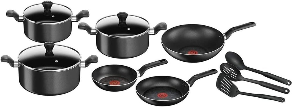 Tefal 12PC Set Super Cook Non Stick - Thermo-spot marking turns full red when the pan reaches the ideal temperature, High-quality titanium-infused coating delivers outstanding non-stick performance, Compatible with all hobs except induction, Easy to use and clean.