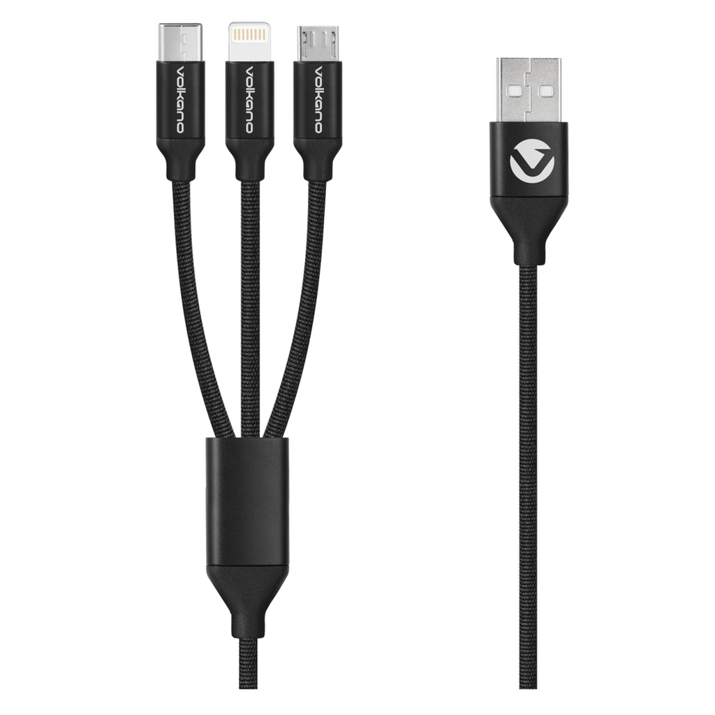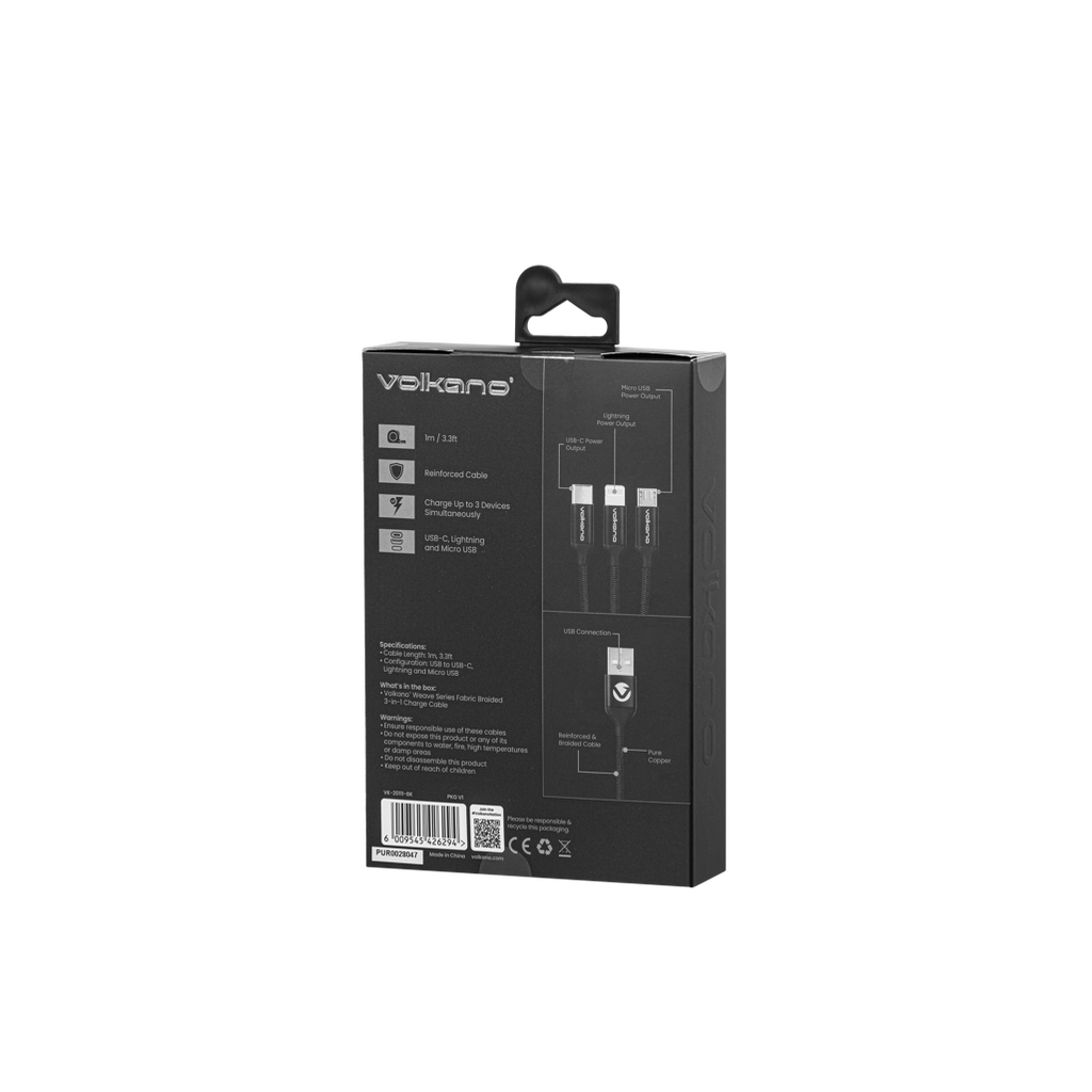 Volkano Weave Series Fabric Braided 3-in-1 (Type-C/Lightning/Micro) Cable 1m - Black